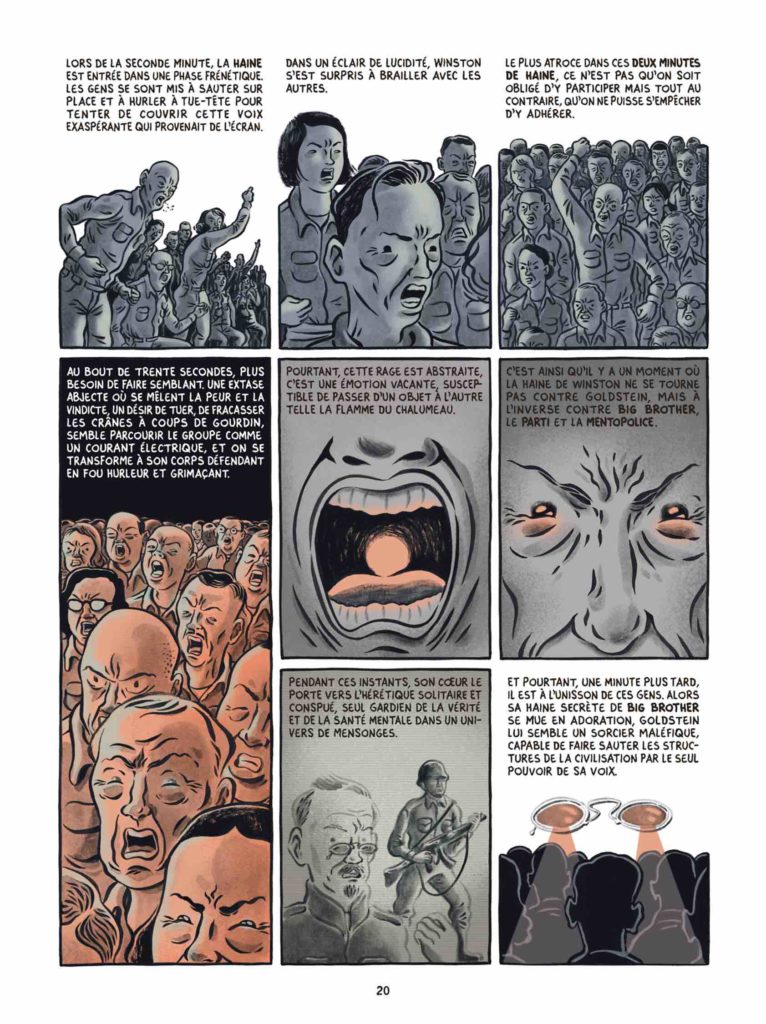 TrĂšs fidĂšle au roman mythique dâOrwell qui sâinspira du nazisme du stalinisme et de tous rĂ©gimes totalitaires, cette BD nous plonge dans la noirceur de ce rĂ©cit suffocant sans espoir ni ouverture. La justesse de la rĂ©flexion dâOrwell prouvĂ©e mois aprĂšs mois en observant lâĂ©volution de nos sociĂ©tĂ©s, rend ce rĂ©cit glaçant et terriblement actuel. Fido Nesti nous restitue parfaitement cette ambiance et cette atmosphĂšre avec un dessin sans fioritures et une palette trĂšs resserrĂ©e.