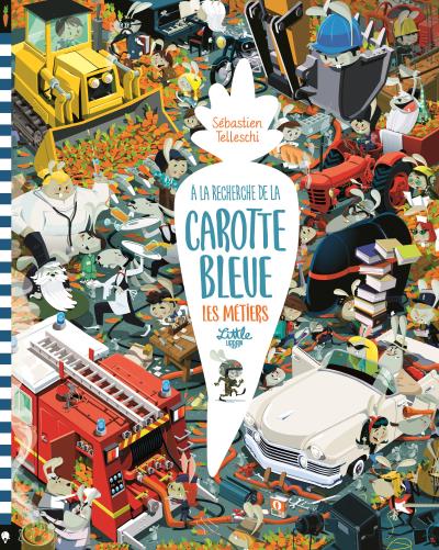 La tribu des lapins a encore une fois perdu la carotte bleue ! Après avoir traversé l’Histoire, les voilà en plein test de différents métiers. Au fil des pages, ces petits héros aux grandes oreilles vont s’essayer au commerce, à l’agriculture, ou bien encore au sauvetage. Mais rien n’est simple, alors gare aux bêtises et aux gaffes ! De plus, la célèbre et convoitée carotte bleue n’est jamais loin, il faut juste bien ouvrir l’oeil ! Après un premier album très réussi, Sébastien Telleschi propose un second volume où les lapins, toujours aussi maladroits et drôles, permettent aux enfants de découvrir tout un panel de métiers, plus ou moins connus. L’illustration grand format, pleine de détails, est moderne et dynamique. Si le texte n’est pas très travaillé, il reste néanmoins agréable à lire. Le principe du « cherche et trouve » est bien respecté, il n’est d’ailleurs pas toujours simple de retrouver la carotte bleue. Alors, à vos loupes ! (A.-S.D.)