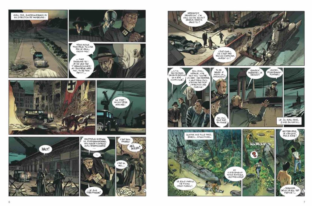 Le dĂ©nouement la sĂ©rie est lâobjet de ce 5e tome, mĂȘme sâil peut se lire quasi indĂ©pendamment des autres tomes. Lâintrigue est double : celle dâune vie extra-terrestre qui ferait des visites rĂ©guliĂšres sur terre et sur les nazis dĂ©faits souhaitant continuer, aprĂšs leur dĂ©faite, leurs expĂ©riences et leur guerre partout oĂč cela leur est possible. On croit aisĂ©ment Ă ces 2 histoires Ă suivre en parallĂšle, avec en bonus le fond historique dâune aprĂšs-guerre chaotique. Le dessin est clair, assez prĂ©cis. On regrettera peut-ĂȘtre lâabsence dâenvolĂ©e sur ce volume oĂč le dĂ©coupage en bulles trĂšs denses ne permet pas de mettre en valeur le coup de crayon de Marchal.