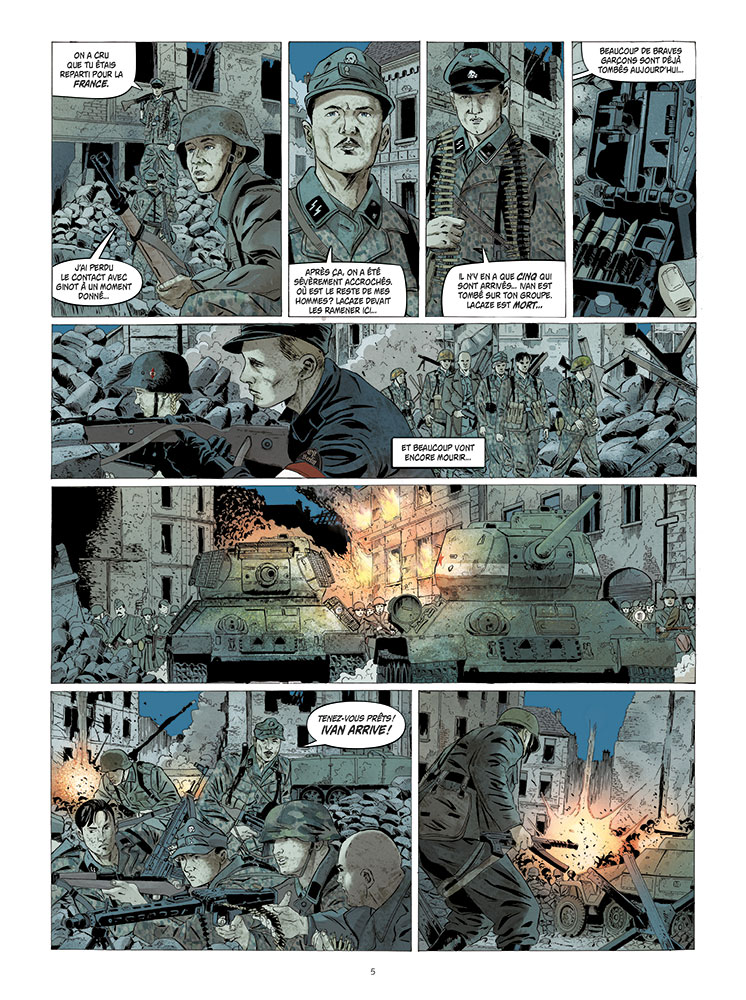 Ces deux premiers volumes de la sĂ©rie illustrent le quotidien des soldats de la division Charlemagne dans ce quâils pensent ĂȘtre le combat destinĂ© Ă sauver lâoccident de lâinvasion soviĂ©tique. Si le scĂ©nario se limite Ă une succession de scĂšnes de batailles urbaines, le moral dĂ©clinant des troupes est subtilement rendu au fil des pages Ă mesure que sâenchainent les revers et la multiplication des pertes. Lâauteur prend Ă©galement le temps de sâarrĂȘter sur le destin de quelques personnages dont on devine que peu Ă©chapperont au pire. La qualitĂ© de ces deux albums tient surtout au dessin prĂ©cis qui rend avec rĂ©alisme lâambiance de la guerre dans Berlin au bord de la dĂ©faite.