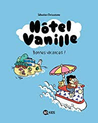 Sur une île paradisiaque à la plage de sable fin et aux parasols ensoleillés, Maurine dirige l’Hôtel Vanille. Elle est secondée par « sonnette », un simplet en laiton posé sur le comptoir et communicant par des « dring dring » agressifs parfois inutiles. Elle court toute la journée pour satisfaire ses clients très divers, assez exigeants, venus de tous les coins de la galaxie pour surfer. Découpées en plusieurs sketchs de deux ou trois pages, les aventures invraisemblables et absurdes d’une petite fille dynamique se succèdent à un rythme rapide. Fleurs, objets et éléments sont animés d’une personnalité propre, il existe des fantômes de ménage, l’ascenseur vomit les bagages avariés, et la mer a besoin d’être chatouillée pour faire des vagues. Cet univers mi-fantastique mi-merveilleux est proche des dessins animés destinés aux très jeunes. Le découpage en grande cases, le graphisme et le décor aux couleurs multiples pourront attirer les lecteurs de quatre ou cinq ans mais il faudra l’aide d’un plus grand pour déchiffrer les bulles. (A.T.)