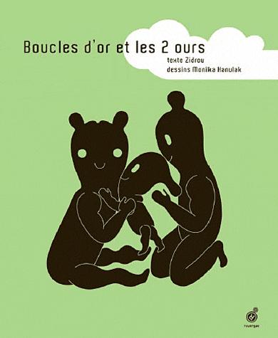 Zidrou dĂ©tourne le conte de Grimm pour raconter une « autre » histoire, de dĂ©sespoir dâabord, puis de rĂ©conciliation avec la vie. Boucles dâor, lâĂ©trangĂšre, nâest plus une intruse mais, le malheur ouvrant Ă la compassion, on lui fait place. Lâillustration, trĂšs Ă©purĂ©e â trois couleurs, dont le noir traitĂ© en ombres chinoises â emplit pages et doubles pages. AssociĂ©es au vert pomme des objets, les silhouettes des personnages anthropomorphes sont Ă©tonnamment expressives, dĂšs lâinstant oĂč on accepte leur figuration minimaliste et le parti pris dâune Boucles dâor noire et surdimensionnĂ©e. Le dĂ©cor est traitĂ© avec la mĂȘme Ă©conomie et la forĂȘt de tous les dangers, judicieusement modernisĂ©e en espace urbain gĂ©omĂ©trique. Ajoutons Ă ce rĂ©cit graphique une main qui suggĂšre la parole muette du langage des signes. Lâensemble, trĂšs original, est beau mais dĂ©routant pour qui ne connaĂźt pas parfaitement le conte traditionnel.