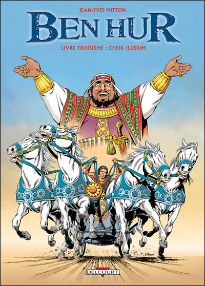 Avant dernier tome dâune adaptation BD de Ben Hur, fidĂšle, prĂ©cise, souvent excellente graphiquement. Le roman de Lewis Wallace, Ă©crit en 1880, fit lâobjet de deux cĂ©lĂšbres adaptations cinĂ©matographiques, une muette en noir et blanc en 1926, lâautre en couleurs en 1959. Cet Ă©pisode narre les retrouvailles du juif Ben Hur, dĂ©sormais fils adoptif dâun gĂ©nĂ©ral romain, avec son ami dâenfance devenu son pire ennemi, le tribun de JĂ©rusalem, Messala. En Ă©merge la figure pittoresque du riche et jouisseur cheik Ilderim, passionnĂ© de courses, qui fournit Ă Ben Hur lâoutil de sa vengeance, un fabuleux attelage de chevaux blancs Ă conduire dans le stade en concurrence avec le quadrige noir de Messala.  La moitiĂ© de lâalbum est consacrĂ© Ă la course fabuleuse, mise en scĂšne dans un dessin rĂ©aliste classique touchant la perfection. Dommage que la premiĂšre moitiĂ© soit encombrĂ©e de dialogues bavards. MĂȘme vaincu, Messala gagne en rĂ©vĂ©lant au vainqueur de la compĂ©tition que sa mĂšre et sa soeur sont bien vivantes, mais lĂ©preuses⊠Rendez-vous au Golgotha !
