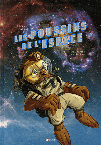 Dans un poulailler vivent des poussins pleins d’ambition. Sous l’oeil et l’arbitrage d’une jeune adolescente humaine, Adèle, se déroule un concours entre le groupe des filles, mené par Lucile, et le groupe des garçons, sous le commandement d’Achille, afin de construire une fusée qui leur permettra de voler jusqu’à la Lune (anniversaire d’Apollo 11 oblige). Dans un découpage aéré et de grandes cases, les dessins de Batist, modernes pour les personnages, et agréablement classiques pour les décors et les couleurs, très soignés, se regardent avec plaisir. Il est regrettable que le scénario ne soit pas à la hauteur. Cette histoire d’amitié et de rivalité entre garçons et filles manque trop de péripéties pour éveiller l’intérêt, et l’humour en est quasi absent (sans compter les sommets d’invraisemblance du postulat de départ, c’est une fiction mais quand même). Le principal mérite de l’ouvrage est de montrer des filles qui ne se laissent pas impressionner par la technique, et construisent une fusée plus performante que celle des garçons (même si elle est mauve à fleurs et si Achille, meilleur pilote, la conduira).