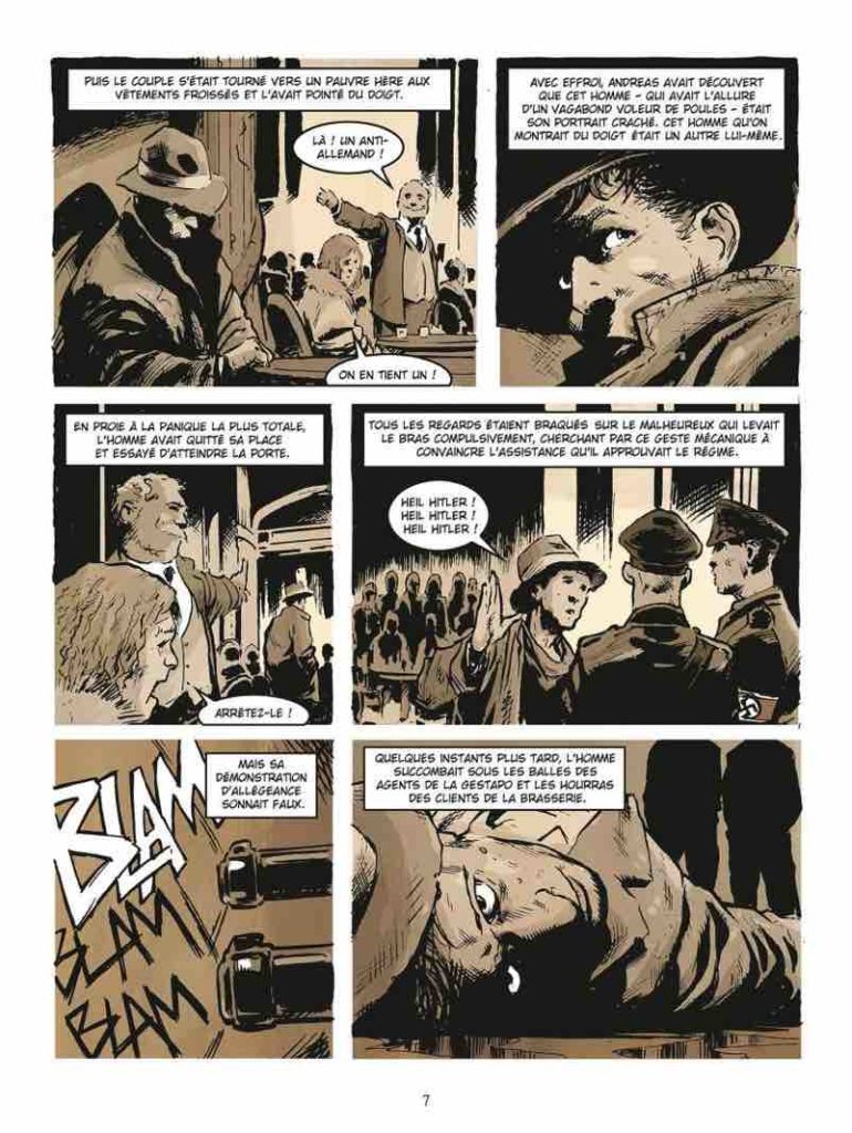 Cet album est l’adaptation en BD du roman de Michel Goujon paru en 2013. L’histoire est celle d’un allemand moyen des années 30 aux prises avec ses doutes face à l’inacceptable dérive du régime nazi et à l’instabilité de son couple fragilisé par l’absence d’enfant, et les divergences politiques croissantes avec une épouse et une belle famille acquise au régime. Le lecteur ne peut s’empêcher, et c’est sans doute tout l’objet de cette fiction, de se poser la question de ce qu’aurait été sa réaction face à de tels événements. Le dessin de Garcia, tout en contraste et noir dominant nous immerge dans cette ambiance pesante qui envahit peu à peu la vie d’Andreas Kuppler. Voilà un album qui aborde une période de l’histoire sous un aspect peu commun qui ne peut laisser indifférent.