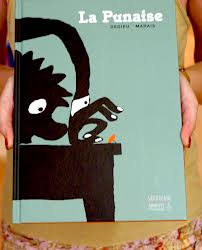 La punaise était là, sur son bureau. L’élève la chasse d’une pichenette , rate la corbeille et voilà qu’elle atterrit sur la chaise du maître, pointe en l’air. Il fulmine, le coupable reste muet et voilà, de dérapage en dérapage, la planète bouleversée. Le directeur arrête l’école, le maire arrête la ville, le député arrête la région, le président alerte ses collègues. Les dirigeants se réfugient dans leur bunker. Plus rien ne fonctionne, les élèves peuvent écouter la Terre respirer, et comme personne ne signale que le coupable a finalement levé le doigt et reçu le sermon approprié, il ne reste plus qu’à aller à la pêche.Car si on arrête tout, la neige revient sur les sommets et l’eau dans les rivières. Cette fable express est mise en scène dans les aplats énergiques de Thierry Dedieu en noir et blanc sur fond de couleur : vert amande pour l’école et la rivière où un pêcheur nonchalant bouquine, un fil de pêche accroché au gros orteil. L’idée est simple et séduisante : profiter du monde loin des villes aux rues labyrinthiques, aux immeubles écrasants sur fond orange. Des cadrages serrés attirent l’attention sur la chaise et la punaise, la mâchoire indignée du maître. On gagne le ciel pour contempler la mer noire et les bateaux en silhouettes blanches. Un dirigeant affolé erructe une noire fumée, panache symbolique de la pollution. Les présidents accablés, recroquevillés sur leur serviette, se terrent dans leur bunker – conscients de leur responsabilité ? Écolo ? Oui. Rigolo ? Tout autant, pour petits et grands et alimenter les discussions.
