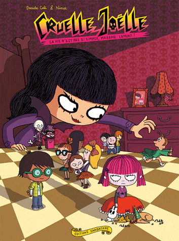 Ambiance gentiment macabre et humour noir bon enfant de rigueur pour cette BD. Elle met en scène une mère passablement indigne, qui, souvent absente (elle fait des heures sup!), nourrit sa fille avec des pizzas et des hamburgers, rate consciencieusement toutes les réunions de l’école, et utilise sans vergogne l’anniversaire de Joëlle pour accomplir ses basses oeuvres. La galerie d’enfants n’est pas piqué des hannetons non plus – à l’exception de la fillette, parfait support d’identification. Le dessin ludique aux accents enfantins désamorce tout morbide, vivement coloré de tons violet, rouge et vert qui s’accordent bien avec l’ambiance de cimetière. Amusant et plaisammant transgressif.