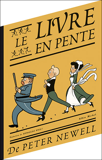 Sur la couverture, un agent de police, un jeune homme, une nounou dĂ©valent une pente en se hĂątant : câest celle du livre, construit en biais dâoĂč son titre – ! Ce jour-lĂ , la nounou a laissĂ© Ă©chapper la poussette du petit Bobby. Le landau, vĂ©ritable bolide, dĂ©vale les rues de la ville dans une course folle, Ă la grande joie du marmot. DĂ©truisant lâĂ©tal du camelot, crevant la grosse caisse de la fanfare, poussant Ă lâeau le brave pĂȘcheur, il finira sa course dans une meule de foinâŠ.