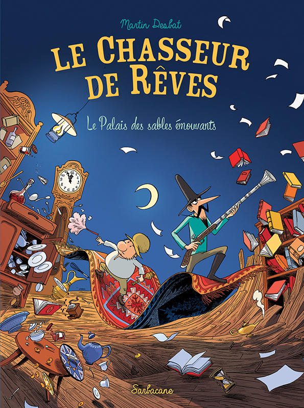 Sancho achète au marchand ambulant un livre, un tapis, une flûte, des lampes… Tandis que son maître lit, Sancho joue de la flûte ; le tapis décolle avec les deux hommes, survole l’océan, arrive dans une cité « propice aux aventures merveilleuses », espère le proto Don Quichotte. Il course un chat qui se transforme en moult animaux, fuit les habitants furieux des dégâts qu’il a provoqués au passage, se réfugie, avec Sancho, chez un homme qui les cache dans sa cave… débouchant en pleines montagnes. Un air de flûte, et c’est reparti ! Le chasseur de rêves, accompagné de son fidèle serviteur, poursuit ses aventures poétiques dans le Moyen-Orient des Mille et une nuits. Les épisodes s’enchaînent avec fluidité, même si on change de décor à chaque fois, grâce à un dessin très lisible, riche en détails, qui porte l’histoire. Il y a peu de texte, juste l’essentiel pour comprendre. C’est le troisième tome (NB avril 2016 et janvier-février 2018), et c’est toujours aussi drôle, inventif et charmant. Les albums peuvent se lire indépendamment. (M.D.)