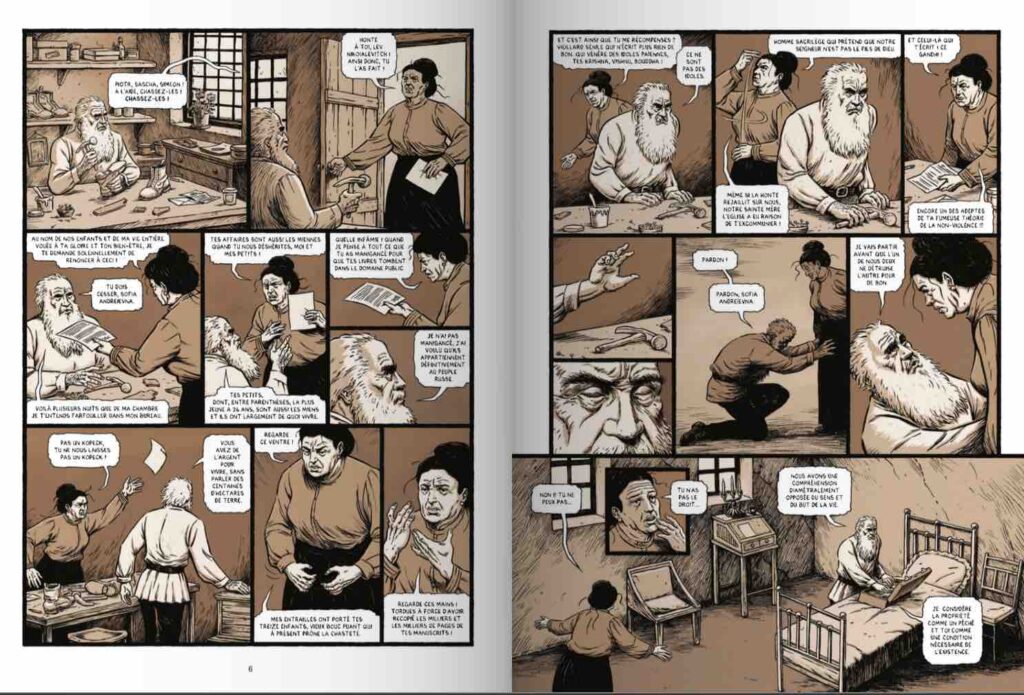 Le roman graphique retrace l’évolution de la pensée de Tolstoï tout au long de sa vie, sur fond de vie de famille au coté de Sofia son épouse, sa plus grande admiratrice mais également sa plus grande critique. Ces deux personnages qui s’aiment d’un amour brûlant, n’ont pas évolué de la même manière au fil des années. Sofia se souciant avant tout de sa famille et de ses conditions matérielles et Léon lui, en perpétuelle remise en question, abandonnant au fur et à mesure son œuvre romanesque pour une œuvre existentielle.