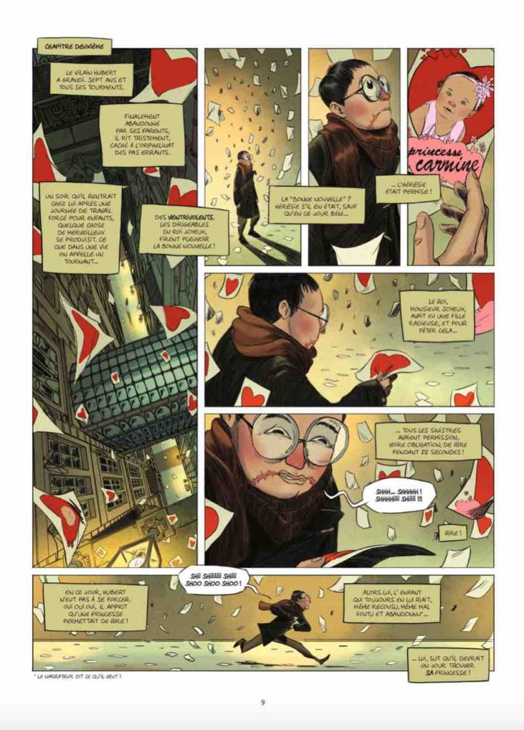 La narration en vers â oui oui, en vers ! â frisant la pĂ©danterie et la brisure permanente du quatriĂšme mur, sert Ă©lĂ©gamment le rĂ©cit qui se montrera bien plus tragique que cette comĂ©die finement dessinĂ©e. Le style est un mĂ©lange entre de lâArt-dĂ©co et les exagĂ©rations urbaines des Ćuvres comme Brazil ou de la sĂ©rie de LâIncal. Le tout dĂ©licatement adouci par les trognes baroques et mignonesques des protagonistes. Le titre et lâhorrible dĂ©figuration de Hubert rappellent sans nul doute lâHomme qui rit de Victor Hugo, dont les thĂšmes sur la critique sociale, la rĂ©volution, les personnages caricaturaux emblĂ©matiques sont particuliĂšrement prĂ©sents dans lâHomme sans sourire. A lire et Ă relire une fois avĂ©rĂ© le grand complot de la derniĂšre double page.