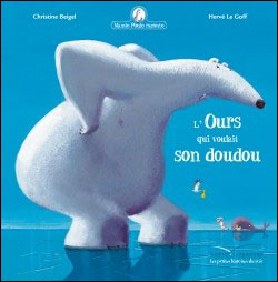 Aux poussins qui rĂ©clament leur doudou pour aller au lit, Mamie Poule raconte l’histoire de l’ours qui voulait son doudou. Canard, cigogne, vache, baleine, chacun s’efforce de lui offrir qui un canard-bouĂ©e, qui un petit lion, une plume ou un oursin… Rien ne lui convient, il exprime sa fureur de diverses façons jusqu’au moment oĂč intervient la tortue…Les histoires de doudou plaisent toujours – loin de tout rĂ©alisme, celle-ci est farfelue et joue sur les surprises, les sons, les mouvements, les jeux de mots. L’illustration Ă la gouache pleine de mouvement, Ă dominante de bleu glacier, est plaisante. Elle brosse un ours polaire tout en souplesse, au museau allongĂ©, et une joyeuse galerie d’animaux aux formes ludiques.