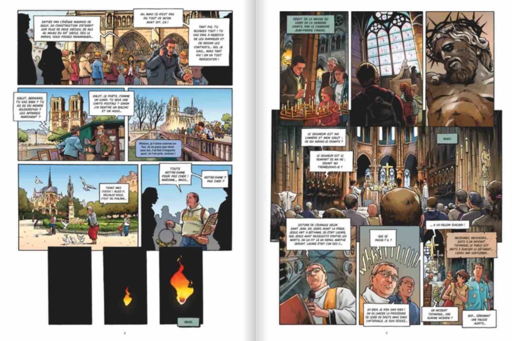 Les auteurs de cette BD documentaire et historique nous font revivre de minute en minute la nuit du drame et, le cĆur encore serrĂ© au souvenir de lâĂ©vĂšnement, on suit lâinĂ©luctable effondrement de la forĂȘt de poutres et du toit de plomb. On y dĂ©couvre surtout des dĂ©tails mĂ©connus de lâincroyable action des pompiers de Paris, dont beaucoup ont risquĂ© leur vie pour un Ă©difice qui nâest pas seulement fait de pierres, de bois et de mĂ©tal. StĂ©phane Bern et ses co-auteurs apportent judicieusement une touche historique au rĂ©cit de cette nuit de feu, par dâintĂ©ressants retours dans le temps sur lâĂ©dification de Notre-Dame ou lâacquisition de la Couronne dâĂ©pines par Sainte HĂ©lĂšne.