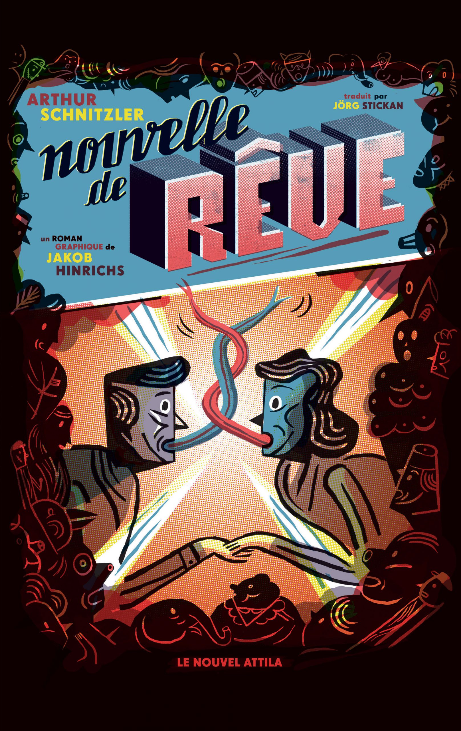 Le volume est divisé en deux parties : la première est un roman graphique écrit et illustré par Jakob Hinrichs inspiré de la nouvelle éponyme écrite en 1926 par l’auteur autrichien Arthur Schnitzler, reproduite in extenso dans la seconde partie. Ce dernier était influencé par Freud et ses théories toutes récentes dans cette nouvelle que Stanley Kubrick adapta dans le célèbre Eyes Wide Shut. L’histoire met en scène un couple : le docteur Fridolin et son épouse. Celle-ci lui raconte un jour ses rêves érotiques excitant chez lui un grand appétit sexuel qui le mène à participer à de folles expériences carnavalesques de débauches. Tout se termine bien, car les coquineries ne relevaient que du rêve. Notons l’originalité du graphisme stylisé, onirique, surréaliste pour ce voyage initiatique à travers la jalousie, l’inconscient et les désirs inavouables. Cet OENI : Objet Écrit Non Identifié est édité par la Société d’édition « Le nouvel Attila » (qui se présente soucieuse de cultiver les genres inclassables et les mauvaises herbes littéraires).