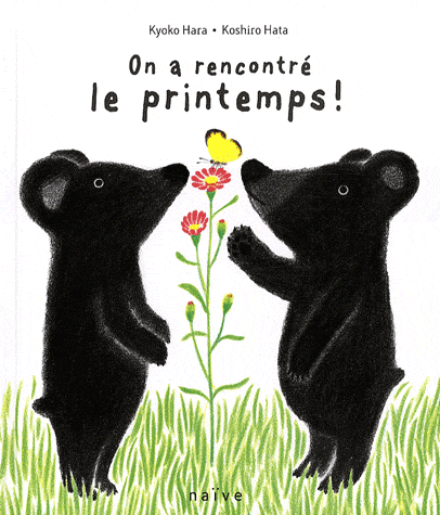 Croqués au fusain noir, deux oursons s’éveillent du long sommeil d’hiver dans l’antre familial sombre, mais chaleureux. Papa et Maman promettent l’arrivée du printemps, avec les feuilles vertes, les fleurs multicolores. Il fait encore bien froid à la lucarne sombre, mais, sur les grandes doubles pages, le noir subtil s’efface devant la beauté blanche des dernières neiges et la légèreté des branches. Sortie autorisée, mais la grenouille, puis les petits lérots, préfèrent rester au chaud. Découragés, du haut de la colline, cerclée de bois noirs, les oursons voient venir un point jaune, vert, rouge, qui secoue leur lassitude : « Ça y est, un printemps ! ». Une fillette les accueille avec des gâteaux, et soudainement, tout fleurit autour d’eux. Sans être le miracle printanier espéré : le pinceau multicolore fait regretter le fusain qui donnait mystère et élégance à la recherche de cette fameuse nouvelle saison.