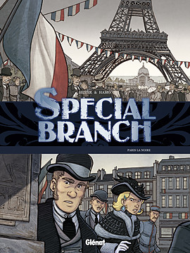 En 1889, le Sea Horse, chargé de marchandises destinées à l’exposition universelle de Paris, est coulé par un sous-marin. Un peu plus tard, le premier ministre britannique reçoit une lettre de menace : il devra payer une rançon de vingt tonnes d’or pour sauver les intérêts de la Couronne. Une photo de la Tour Eiffel précise le lieu de la menace. Le trio de choc de la Special Branch, mandaté pour tirer les choses au clair, devra donc collaborer avec la Sûreté Générale française. Pendant ce temps, cette dernière est confrontée à un meurtre que l’auteur a signé en laissant sur les lieux une croix de Sainte Brigitte. Le dessin, simple et un peu malicieux, donne aux personnages des airs étonnés et des grands yeux faussement naïfs. Imperturbablement vêtus de costumes trois pièces avec chapeau melon, ou de robes aux chevilles pour l’unique femme, ils évoluent dans des décors minimalistes. Le récit, bien conduit, se garde toutefois de trop solliciter la sagacité du lecteur qui refermera cette histoire complète en attendant sans trop d’impatience celle qu’annonce la dernière page. (P.P. et C.D.)