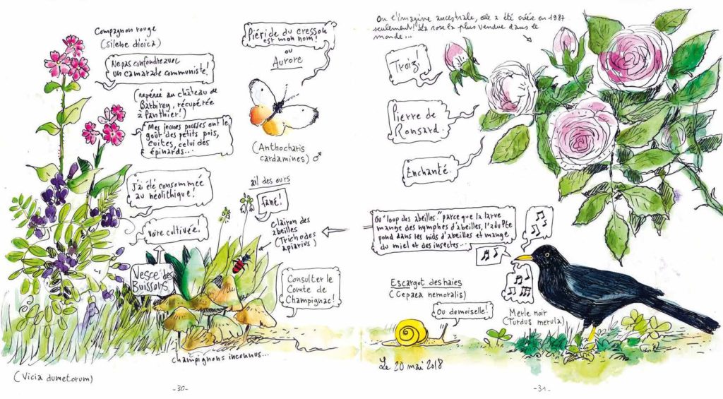 Bien avant le confinement, Fred Bernard s’est installé à demeure à la campagne, et a mûri le projet de relater et dessiner de février 2018 à mai 2019 la vie de son jardin et les promenades alentours. 220 pages qui alternent planches de botanique, paysages à l’aquarelle, dessins à l’encre de Chine, cases où les fleurs dialoguent entre elles et avec l’artiste, où les graines de glycine explosent en onomatopée, clac, bam, boum ! Car Fred Bernard, bien connu en littérature jeunesse, est aussi créateur de bande dessinée et ne se prive pas de recourir aux bulles pour animer ses observations et faire de l’humour ; la littérature est convoquée aussi avec des citations de Ronsard, Colette, Shakespeare… Un peu de mythologie et d’Histoire aussi, en passant et toujours à propos. Sans oublier la musique avec le chant des oiseaux et des paroles de chanson.