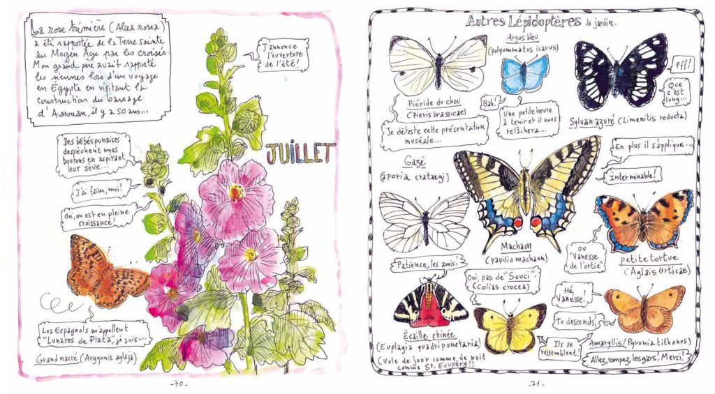L’auteur révèle une nouvelle facette de son art, une curiosité permanente et une culture impressionnante qui fait des liens entre l’observation scientifique, les références littéraires et historiques, le bonheur de témoigner de la richesse de la nature en s’appropriant un dialogue avec le très proche – fleurs, insectes, papillons, oiseaux – ou prenant du recul pour admirer, tout simplement, et rendre la poésie des lieux. Ce voyage immobile est en réalité un parcours tous azimuts, jalonné de surprises et de trouvailles constantes, d’émerveillements qui arrivent comme des pauses, de sourires qui invitent à se pencher sur le détail. Pour tous les passionnés de jardins, de nature et de dessin.