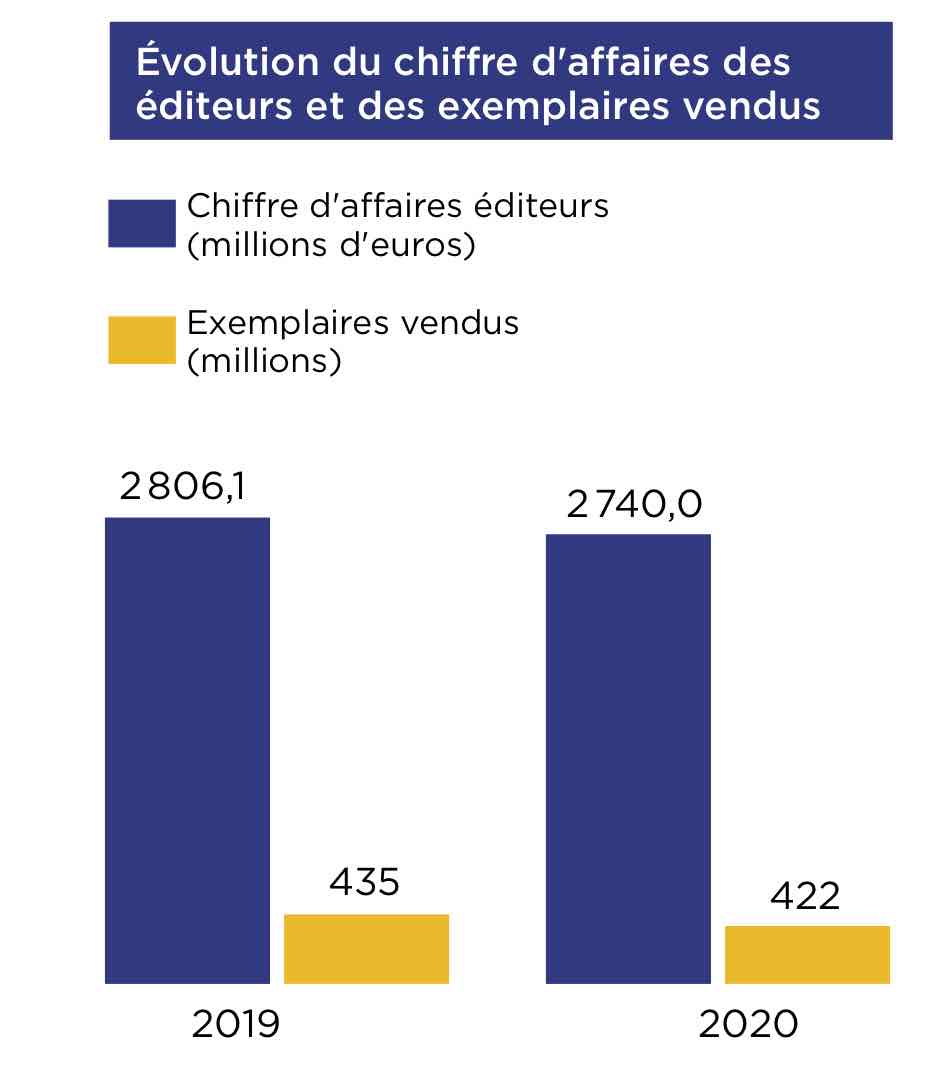 Afin de s’adapter à la situation, les éditeurs ont dû annuler la publication de titres prévus en 2020 ou décider d’un report sur 2021. Au total, la production éditoriale des éditeurs a enregistré une baisse de 9,1 %, impactant particulièrement les nouveautés (en nombre de titres publiés et nombre d’exemplaires produits) alors qu’elle a été plus modérée sur les réimpressions. Dans le même temps, la production en nombre d’exemplaires a baissé de 11,6 %.