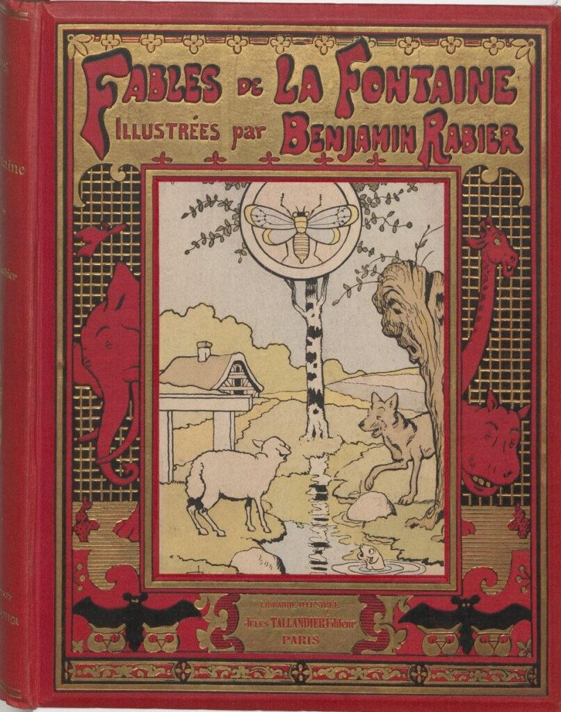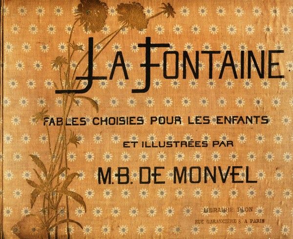 En 1880, Maurice Boutet de Monvel (1850-1913), publie La Fontaine. Fables choisies pour les enfants, un album de format oblong. Sous la couverture parsemée de fleurs stylisées, on retrouve son graphisme à l’esthétisme symbolisant : scènes dépouillées, rigueur de la composition. Les images détourées voisinent rigoureusement les textes qu’elles illustrent en couleurs douces où abondent les gris, les bruns, les jaunes pâles… Elles ont un charme bien désuet, une naïveté propre à séduire les enfants dans ces scènes très lisibles qui accompagnent les prémices de la bande dessinée.