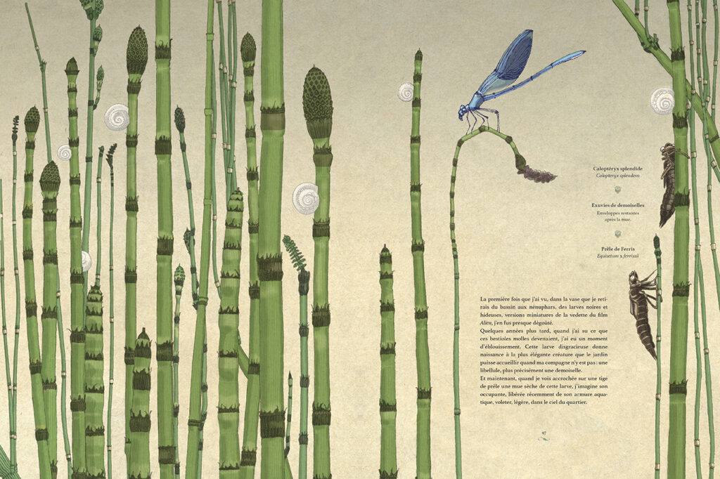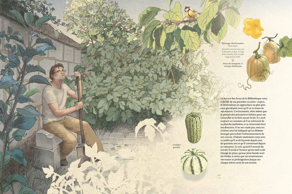 Les planches botaniques alternent avec des scĂšnes de la vie au jardin : souvent des doubles pages somptueuses oĂč on devine, comme dans certaines toiles de Monet la robe claire dâune dame, les occupants de ce jardin, saisis dans le mouvement de leur vie : un enfant qui joue, un vieil homme qui sarcle, une jeune femme avec sa bicyclette. Belles images du temps passĂ©. Les hommes façonnent le jardin comme le jardin les façonne. Nâest-il pas, plus quâun espace, « la somme des moments oĂč on sây retrouve » ?