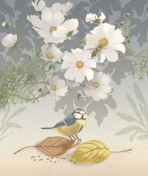 Planche aprĂšs planche, le texte dâaccompagnement sâinscrit dans lâimage au grĂ© de lâespace laissĂ© libre par le foisonnement vĂ©gĂ©tal : il joue avec sobriĂ©tĂ© son rĂŽle dâidentifiant documentaire et ajoute Ă la beautĂ© de la fleur ou de lâoiseau, ou de lâinsecte, la magie du nom savant. Ainsi de cette premiĂšre rencontre dans le jardin de janvier sous-titrĂ©e : Jean-NoĂ«l, Rouge-gorge, Erithacus rubicula ! Savoureux mĂ©lange des genres : un Erithacus nommĂ© Jean-NoĂ«l⊠Le sĂ©rieux nâexclut pas la fantaisie affectueuse dâun improbable prĂ©nom.
